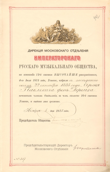 Грамота, выданная С. П. фон Дервизу, на звание почетного члена Московского отделения Русского музыкального общества с подписью от 6 ноября 1885 г. председателя Русского музыкального общества великого князя Константина Константиновича