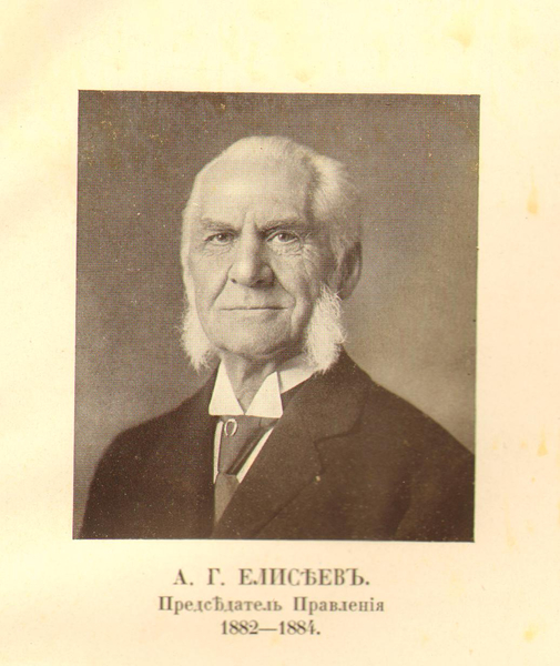 Елисеев Александр Григорьевич тайный советник Меценат, банкир, петербургский купец 1-й гильдии. Совладелец семейного товарищества. В 1882–1884 председатель правления Петербургского частного коммерческого банка, затем до 1892 член правления Петербургс